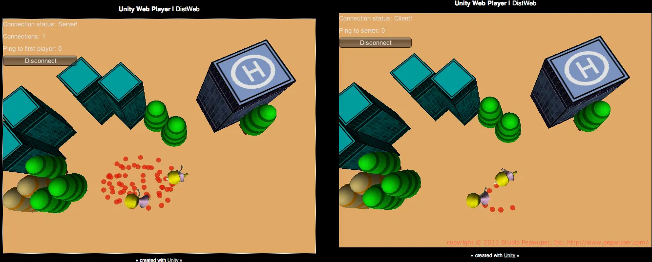 With almost no prior experience with multiplayer games, we started using Unity built-in networking as it seemed the easiest approach. Unity Networking is nicely integrated into Unity and works very well for rapid development. Network Views are components that make game object network-aware. Through Network Views, using State Synchronization and Remote Procedure Calls, any kind of multiplayer game logic can be implemented.